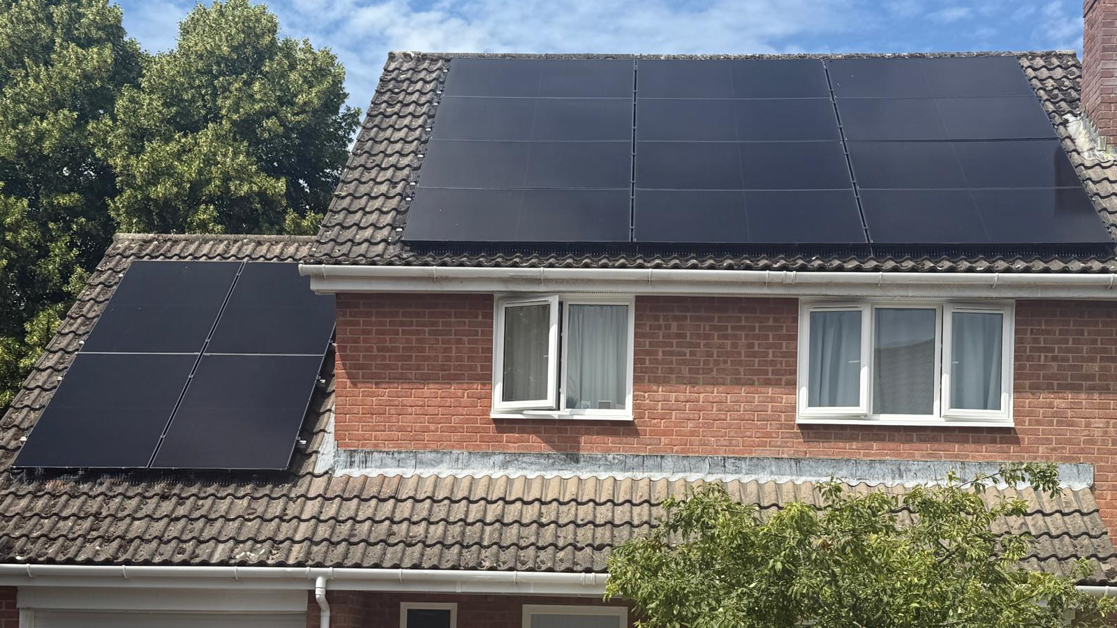 We have added 24 solar panels to our house. We have 12 on the front roof, 4 on the garage roof, and 8 on the rear roof. The front panels are facing SSE and the north ones NNW. Since these were installed on the 13th June there has been loads of sunshine. All the panels, split into three strings of 8, are generating well.